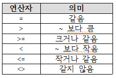 - 조건이 참일 경우에 조건을 만족하는 행이 반환 됨