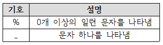 - LIKE 조건을 사용하여 원하는 문자를 검색할 수 있음