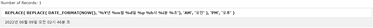 DATE_FORMAT(NOW(), '%Y년 %m월 %d일 %p %h시 %i분 %s초');