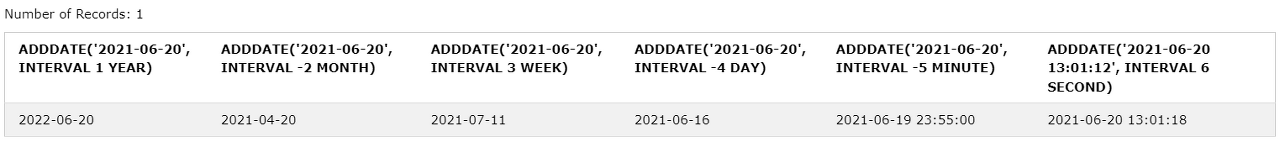 ADDDATE('2021-06-20 13:01:12', INTERVAL 6 SECOND);