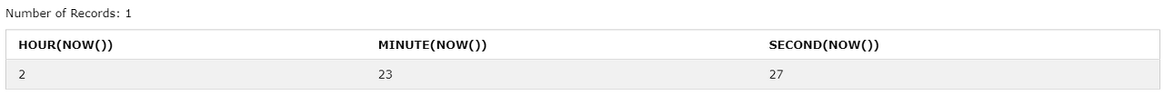 HOUR(NOW()), MINUTE(NOW()), SECOND(NOW());