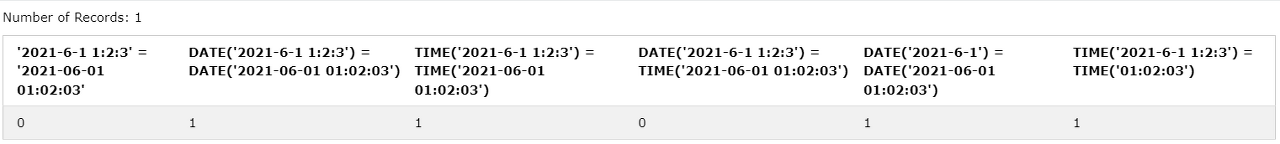 DATE('2021-6-1 1:2:3') = TIME('2021-06-01 01:02:03'),