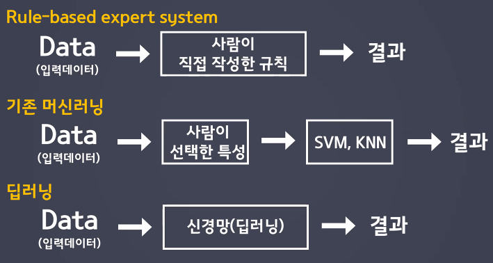 - 컴퓨터비젼, 음성인식, 자연어처리, 신호처리 등의 분야에 적용 => 모든 문제를 딥러닝으로 해결하지 않는다. 기존 머신러닝 모델이 잘 동작하는 경우도 있다.