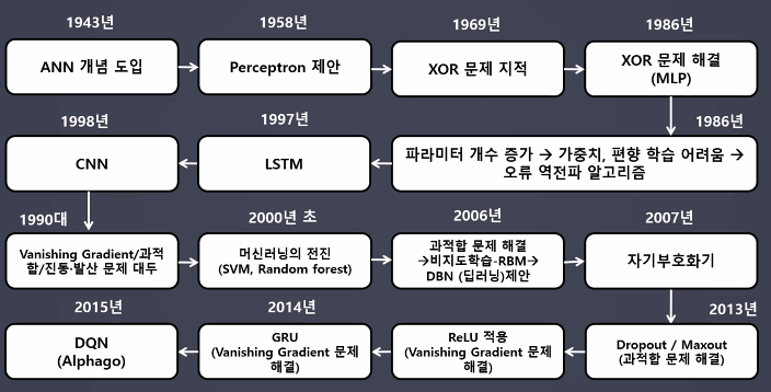 - 사람의 신경망을 모방하여 기계가 병렬적 다층 구조를 통해 학습하도록 만든 기술