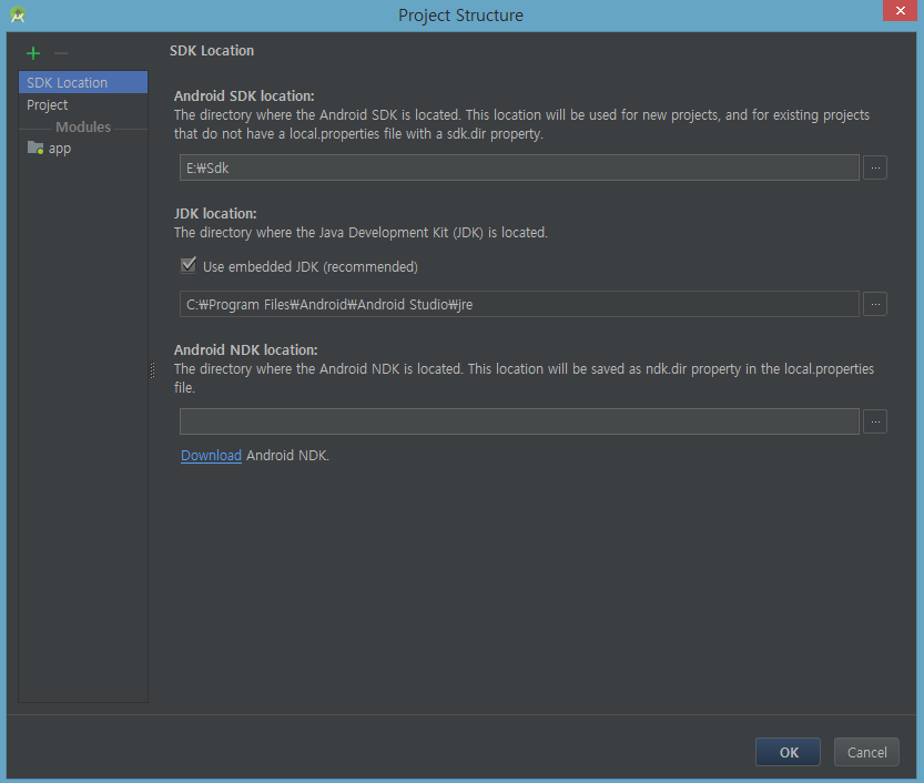 File -> Project Structure -> SDK Location 에서