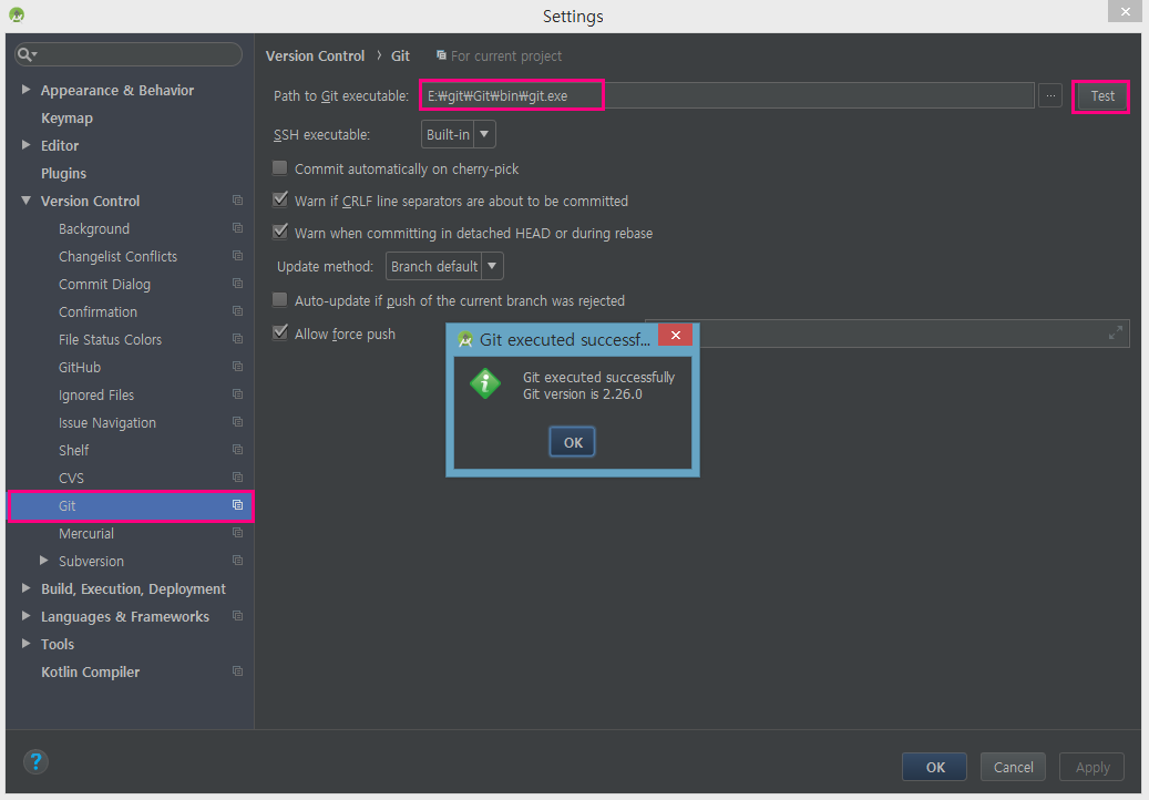 Test 버튼을 클릭 후 아래 화면처럼 나온다면 Git이 정상적으로 설치된것입니다.