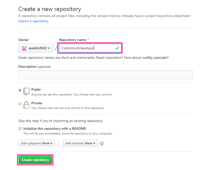 생성하고 싶은 레포지토리의 이름을 적고 CreateRepository을 클릭 합니다.