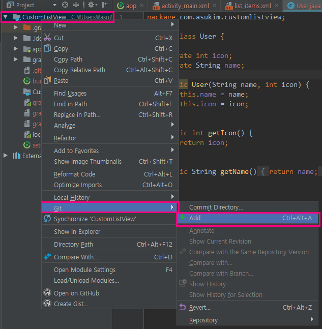 프로젝트명에 마우스 왼쪽을 클릭한 후 Git - Add을 합니다.