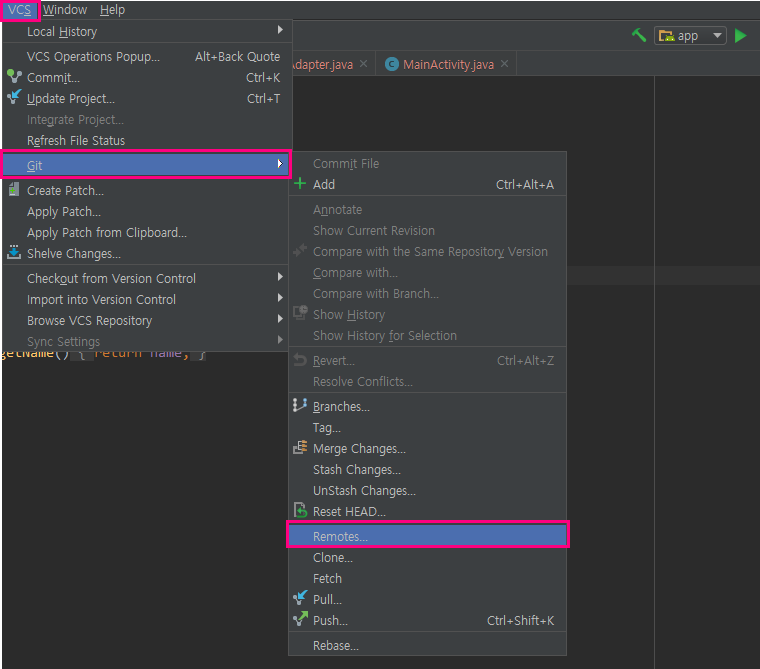 VCS - Git - Remotes 을 클릭합니다.